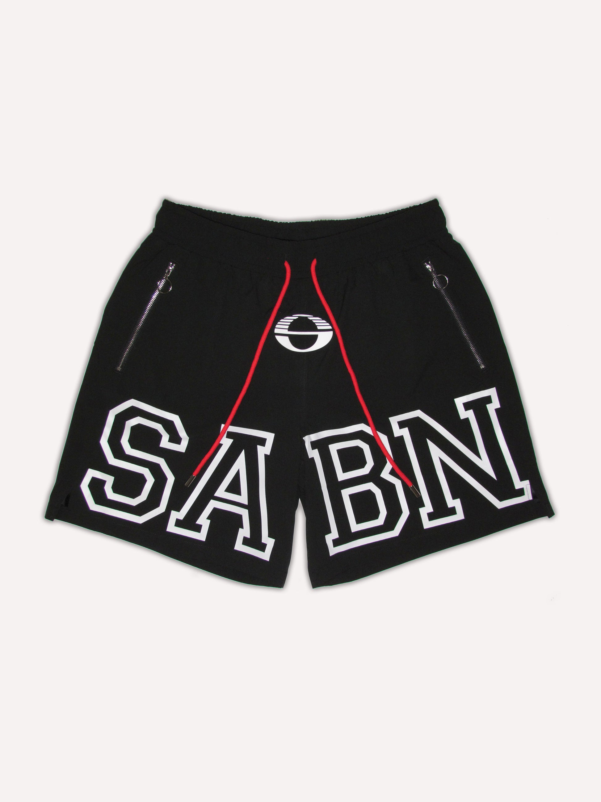 Premium designed lightweight polyester shorts with satin inline. The SABN original logo print across the front legs. Colored drawstrings with matching tonal silver metal hardware. Twin zipper pockets with a 3D silicone rubber SABN emblem front and center.